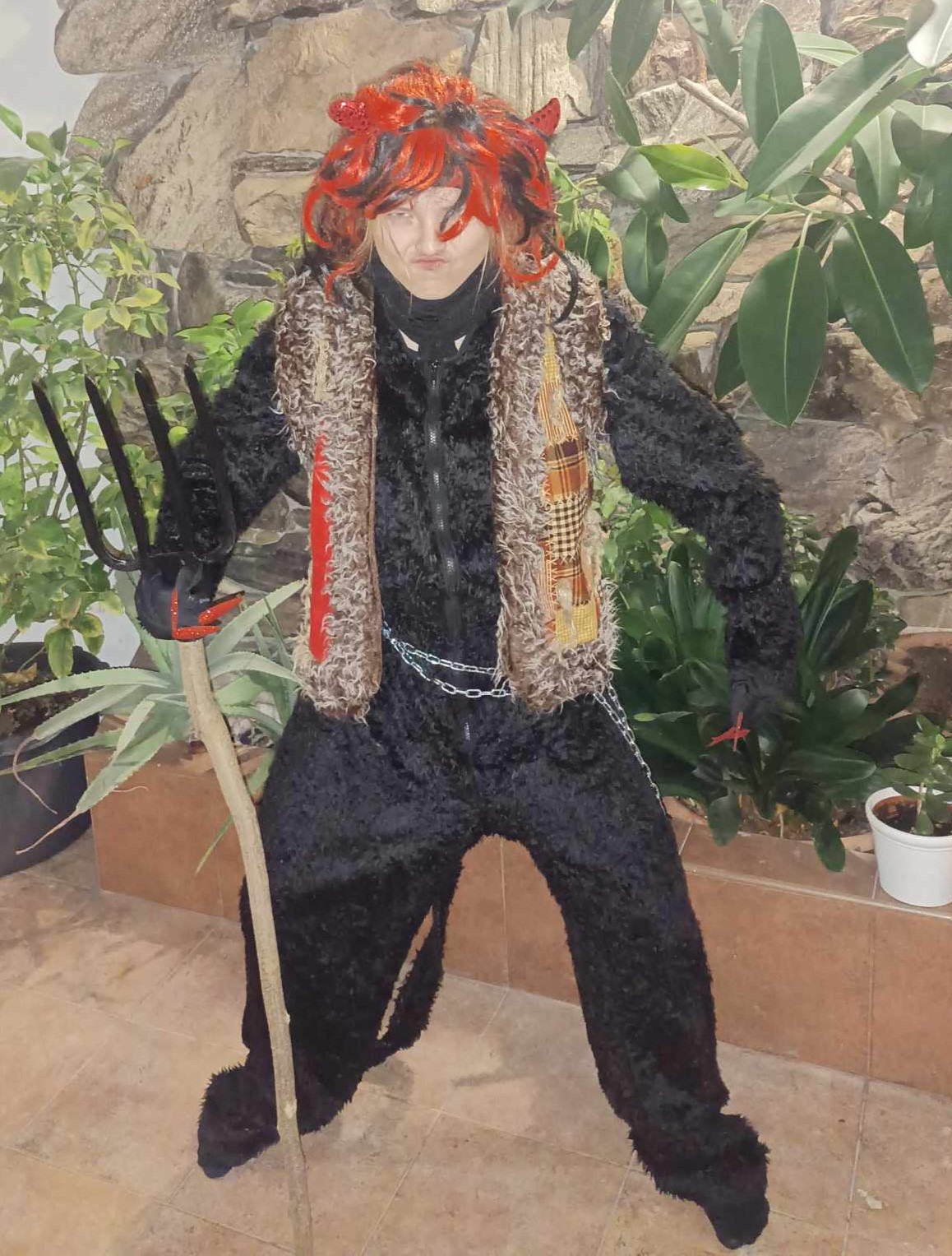 ČERT… paruka s rohy, overal s ocasem/šedý "kožich" s ocasem a kalhoty, vesta: strakatá/šedá, rukavice s drápy, vidle/pytel/řetěz.