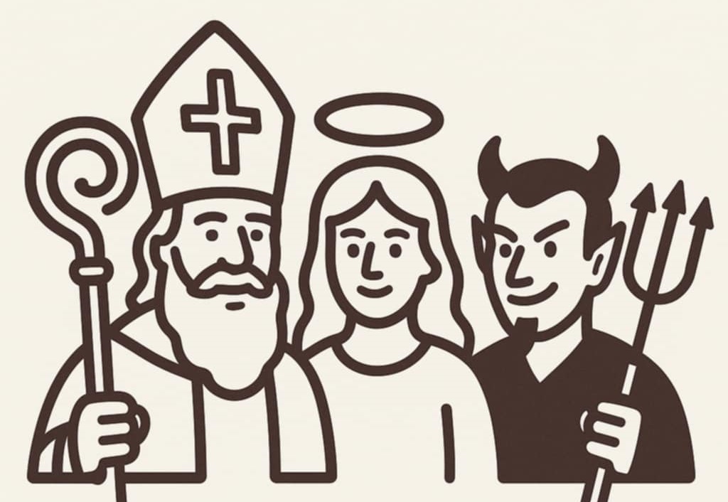 MIKULÁŠ… mitra (čepice), paruka a vousy, plášť, štola (šerpa), košile-suknice, berle.